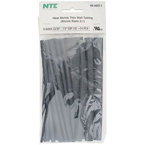 NTE Electronics HS-ASST-1 Thin Wall Heat Shrink Tubing Kit, Black, Assorted Dia., 6" Length, 24 Pieces