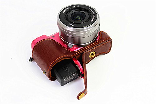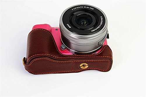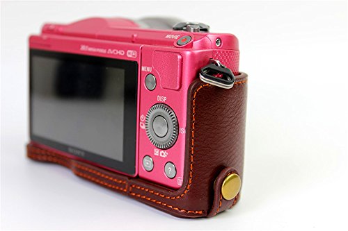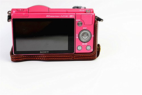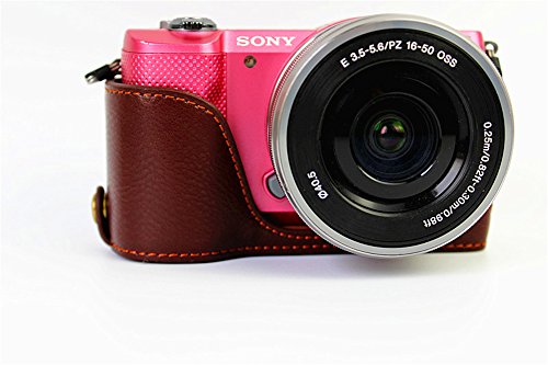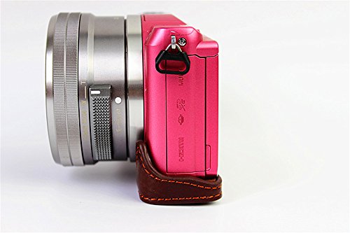 BolinUS Handmade Genuine Real Leather Half Camera Case Bag Cover for Sony Alpha A5100 A5000 Bottom Opening Version + Hand Strap -Coffee