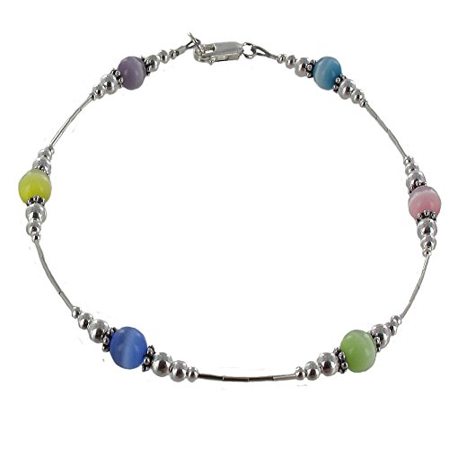 -. Title : Womens Pastel Color Cats Eye (Fiber Optic) & Sterling Silver Ladies Beaded Anklet with Daisies