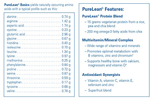 PureLean® Protein Blend: Features include: 15 g vegetarian protein from a unique blend of vegetarian rice, pea and chia proteins; 3 g fiber; 200 mg. omega-3 fatty acids from chia per serving; Superfruit antioxidant blend of acerola, camu camu, quercetin, açai, mangosteen and green coffee concentrate. Multivitamin/Mineral Complex: Features include: Wide range of vitamins and minerals; Promotes optimal metabolism with B vitamins, zinc and chromium; Supports healthy bone with calcium, magnesium and vitamin D; Antioxidant Synergists: Features include: Vitamin A, vitamin C, vitamin E, selenium and zinc; Superfruit antioxidant blend of acerola, camu camu, quercetin, açai, mangosteen and green coffee concentrate.