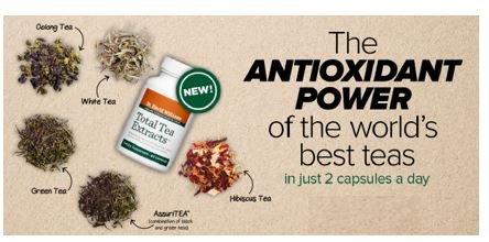 What if you could get all the incredible antioxidant benefits of tea in just 2 small capsules a day? Dr. Williams took what he considers to be 5 of the most beneficial teas from around the globe-green, white, oolong, hibiscus, and AssuriTEA, a clinically studied combination of green and black tea, and combined and concentrated them into 2 small daily capsules. The result is his Total Tea Extracts formula. This antioxidant powerhouse gives you broad range free radical fighting power. Each capsule contains polyphenols including flavonoids and catechins-the most abundant of which is EGCG (epigallocatechin gallate). EGCG is one of the most powerful antioxidants found in nature. Polyphenols can reduce the formation of free radicals in the body, protecting cells and molecules from damage. It's commonly thought that these free radicals play a role in aging. In addition, research shows that EGCG can help promote healthy cholesterol levels. In a placebo-controlled clinical study, individuals who supplemented with 250 mg of green tea extract for 8 weeks had significant improvements in total cholesterol and LDL cholesterol levels compared to placebo. You get 275 mg in Total Tea Extracts. Better yet, research suggests that AssuriTEA supports cardiovascular health and helps maintain healthy blood pressure and blood sugar levels already in the normal range. In a 28-day randomized, double-blind, placebo-controlled clinical study, individuals who supplemented with 250 mg daily experienced benefits in systolic blood pressure and blood glucose levels, along with improvements in blood antioxidant potential compared to placebo. You also get white tea extract, rich in catechin polyphenols and antioxidants; oolong tea extract, which contains theaflavins and thearubigin polyphenols; and hibiscus extract, brimming with antioxidant health benefits. Plus, Total Tea Extracts contains only a very small amount of caffeine-25-35 mg per dose.Feature
