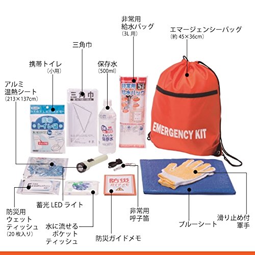【세트 내용】emergency(응급) 백,축광LED라이트,비상용 급수 백(3L용)고, 알루미늄 온열 씨트,수에 흘려 보내는 포켓 티슈(10매)고, 미끄럼방지부 목장갑,휴대 화장실(볼일)고, 방재용 Wet 티슈(20매)고, 비상용 요부코적,삼각건,블루 씨트,보존 수(500ml)고, 방재 가이드 메모/각1