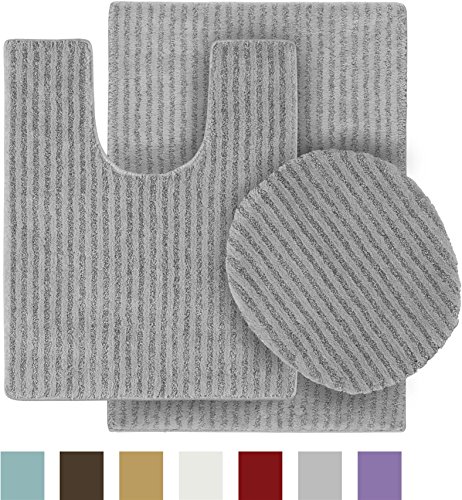 Sheridan bath rugs by Garland Rug are soft and stylish. The stripe design lends a classic understated touch to your bath coordinates collection. This 3-piece rug set comes with an 21 inch x 34 inch bath mat, 21 inch x 24 inch toilet contour and a 17 inch x 14 inch universal toilet lid cover designed to fit most toilet lids. The soft pile of this rug is made of 100% Nylon and features a washable skid resistant latex backing. Like all products made by Garland Rug these Sheridan rugs are proudly made in the USA.Feature