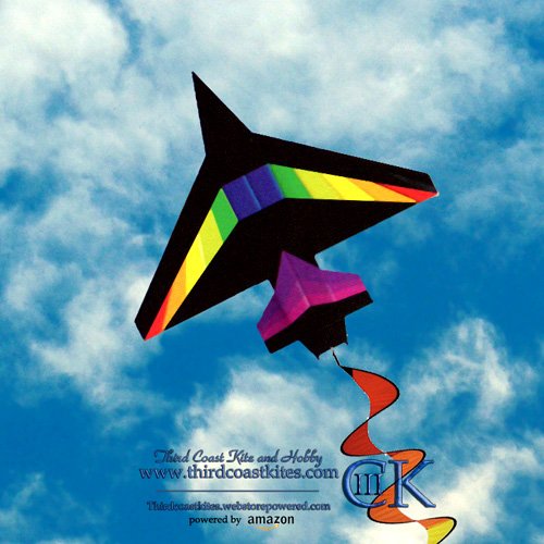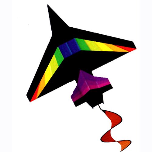 Awesome rainbow colored jet kite! 2D shape for easy flying and high quality construction and spinning twister tail! Looks great hanging in a kids room too! 50x48in. (5-20mph) Includes line and winder.