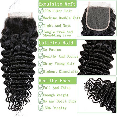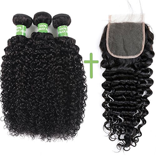 Brazilian Human Hair Bundles With Closure - 100% Unprocessed 7A Brazilian Deep Curly Human Virgin Hair 3 Bundles With Free Part Swiss Lace Closure Natural Color (10 12 14 + 10)
