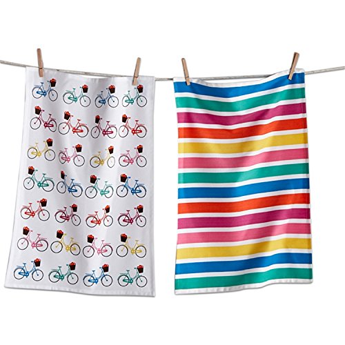 - One has images of bicycles. The other dishtowel has stripes in different colors