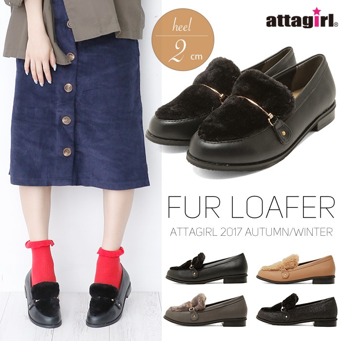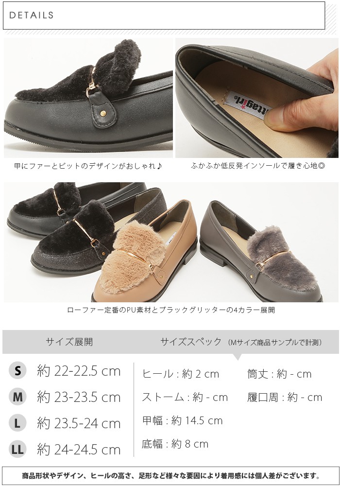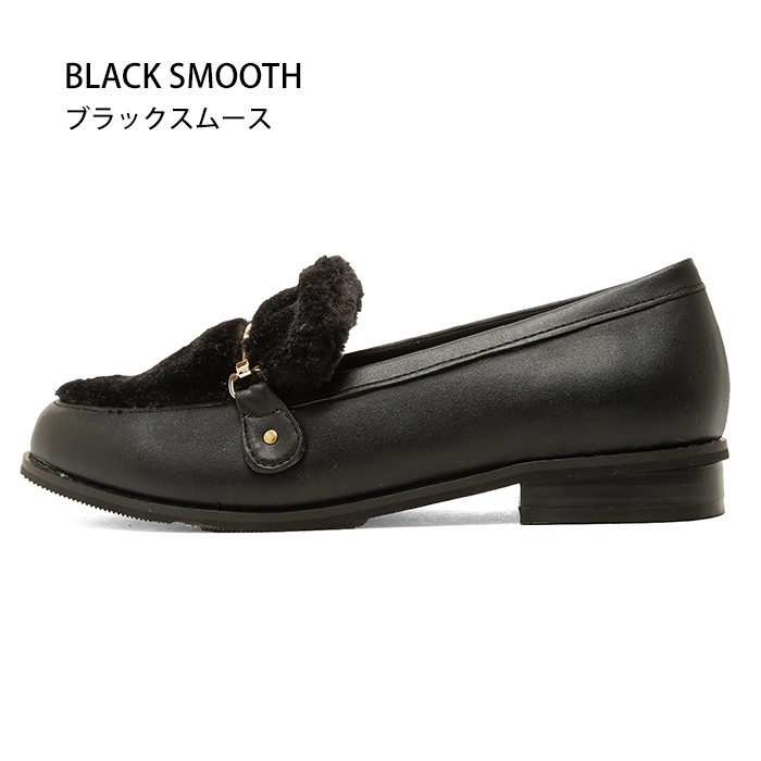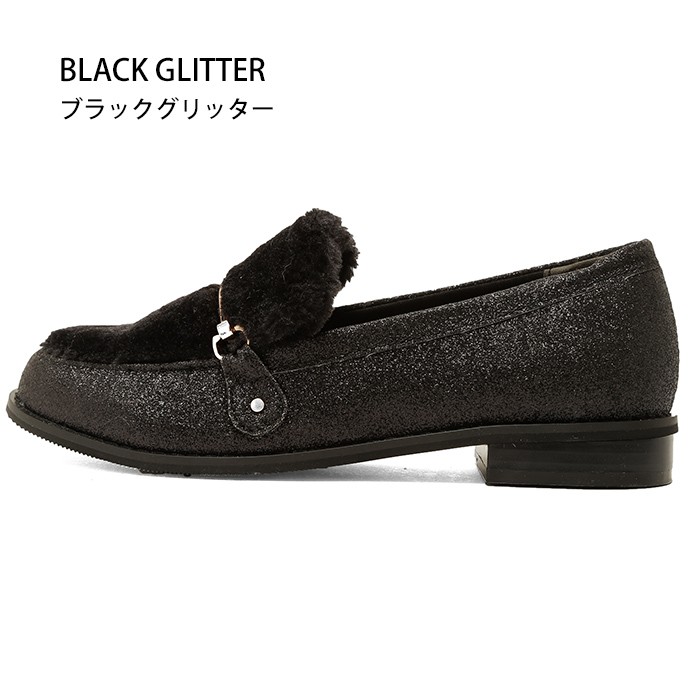 ローファー定番のPU素材とブラックグリッターの4カラー展開。