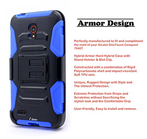 -. Binding : Wireless Phone Accessory -. Brand : NageBee -. Feature : Inner enclosure hard shell constructed from impact-resistant polycarbonate and double-enforced with a shock absorbing silicone inner-sleeve. Corners feature double-thick silicone for outstanding protection against drops and other robust silicone--durable and absorbs impact force / Includes 2 pieces - a hard back case that slides into a locking belt clip swivel holster / A locking swivel belt clip is easily locked into an extended position and provides different viewing angles while watching movies or video calls, also rotatable 180 degrees / Buy with confidence with our 7-Day Money Back Guarantee with No Questions Asked and 30-Day Warranty, NageBee(TM) provides professional nationwide shipping and services. Your buying experience and satisfaction are protected and guaranteed with our professionalism. -. Label : Nagebee -. Manufacturer : Nagebee -. PackageQuantity : 1 -. ProductGroup : Wireless -. ProductTypeName : WIRELESS_ACCESSORY -. Publisher : Nagebee -. Studio : Nagebee -. Title : Alcatel OneTouch Conquest Case, Nagebee - OneTouch Conquest Heavy Duty Hybrid Armor Dual Layer Rhino Kickstand Belt Clip Holster Combo Red Case for Alcatel OneTouch Conquest 7046T(Boost Mobile)