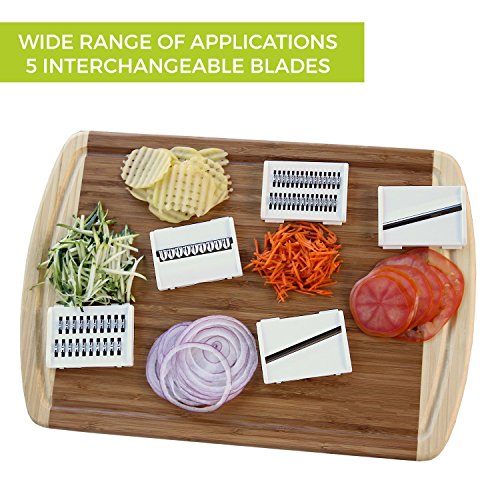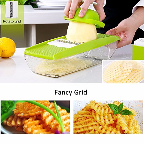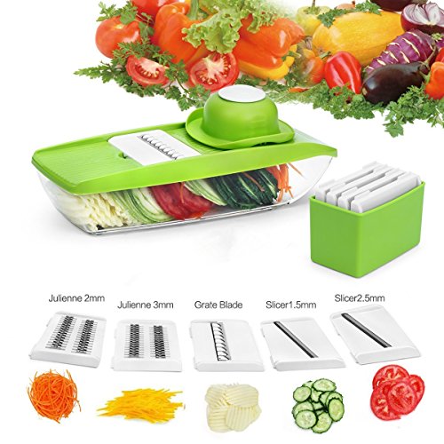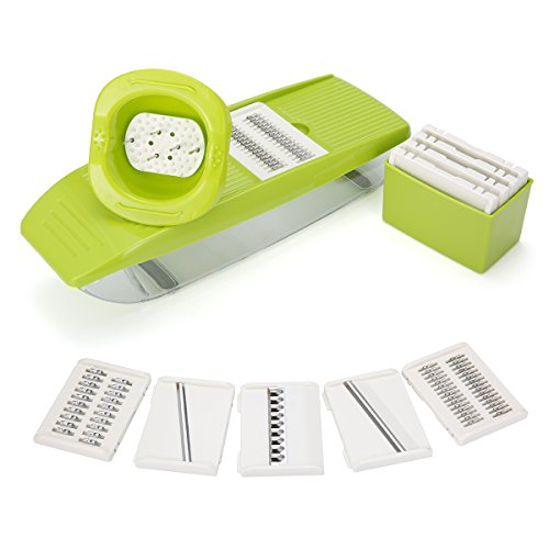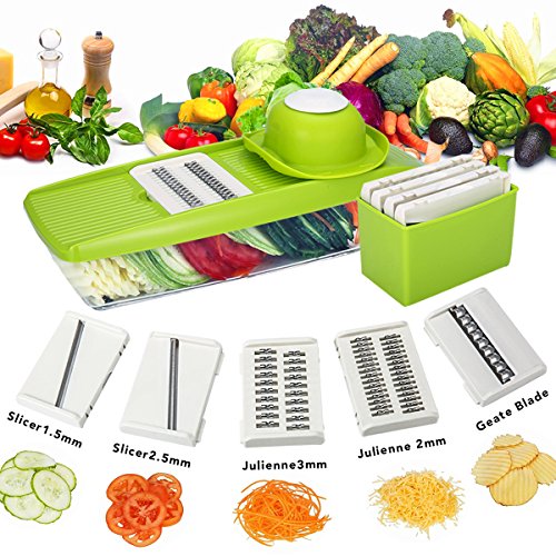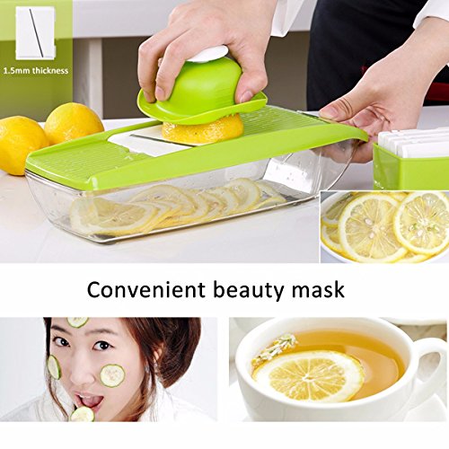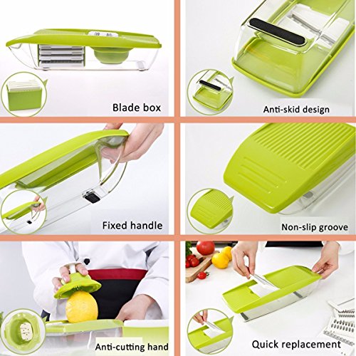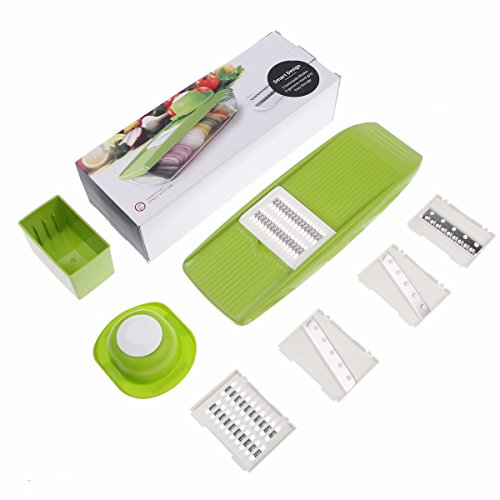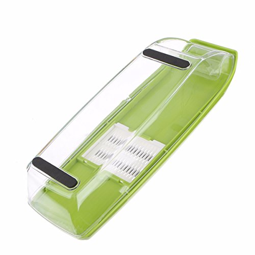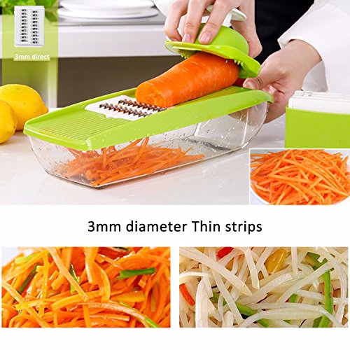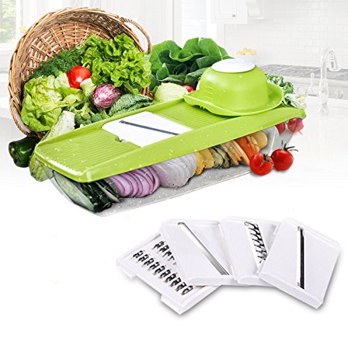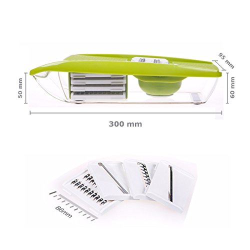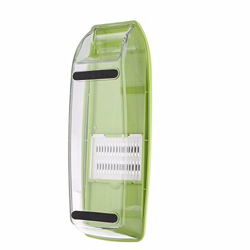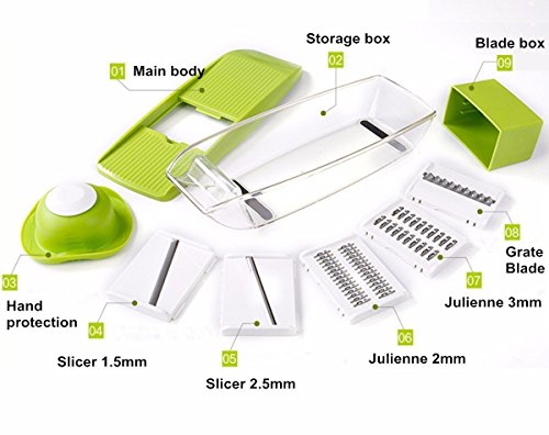 Studio : Moworve Publisher : Moworve Product Description In fast-food dependent society, eating healthy meals is more and more important in our life. But many people are busy for working and have no time to cook a delicious meal.This Mandoline Slicer Set is a convenient tool and will help you when you are cooking.Save your cooking time and you may enjoy cooking.This set is your right choice! Specifications: Material : ABS PS PP; Blades: stainless steel Color : Green Size : 31x9x12cm Weight : 600g Features: 1.This is a high quality mandoline slicer Set.The blades made of high quality stainless steel that is healthy,sharp and rust-resisting.Our slicer can cut, chop, slice and julienne fruits, vegetables and cheeses. 2.The unique design that has a effective hand guard for protecting your fingers from accidental nicks.Have a food container for catching sliced, grated food eliminates the need for a cutting board. 3.This Mandoline Slicer Set is a multifunctional tool.You may use it for cuting all kinds of vegetable and fruits?, like carrots, potatoes,cucumber.Make delicious salads within a few minutes. 4.Make cooking very fun and encourage you to eat healthier.And save time and save money. 5.Easy to clean, easy to use and durable.Have a long sevice life. Note: - The mandoline slicer blades are very sharp.Please be careful when you using it. - When cutting food, please use the safety hand guard to protect your fingers. - Clean the mandoline slicer immediately after use to prevent food from drying on the parts.Do not use more than 60 degrees of water cleaning. - Do not leave the mandoline or any components within reach of children. Package Include: 1 x food container 1x butting board 1 x Vegetable holder 1 x wavy slicer 1 x 1.5mm shredder 1 x 2.5mm shredder 1 x 2.0mm slicer 1 x 3.0mm slicer 1 x Blade storage box 0