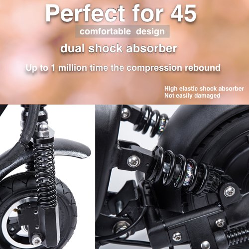 ■Max Speed up to 60Km/h This is The New Hight Speed The scooter reaches spe ■16Ah 48V lithium battery For up to 38 miles or 50-60km of Driving distance ■The scooter features a 500W brushless motor ■front shock and 45-degree dual rear shocks This is a better shock absorber design,Provide a stable ride ■Sport chassis height:12cm Higher chassis, wii be better performance through on any pavement ■IP6 water-resistant battery Capable of withstanding tough outdoor conditions, such as splashing rain and blowing dust. ■Micro USB charging port Built directly into the battery, it enables you to charge your phone or other devices while you ride. ■Foldable aircraft-grade aluminum frame Allows this scooter to be collapsed for easier storage and transportation. ■Powerful mechanical rearl drum brake Help the scooter come to a complete stop safely ■Weight capacity of up to 440 Pounds. Ensures safe riding. ■2Second Quick-Folding Faster and more safety ■8 inchesfront and 8 rear inches Solid tire Adapt to more pavement for confident rolling. ■Handlebar controls and throttle Allow you to check the battery life, turn on the headlight, honk the horn, accelerate and brake■Adjustable height handlebarFeature