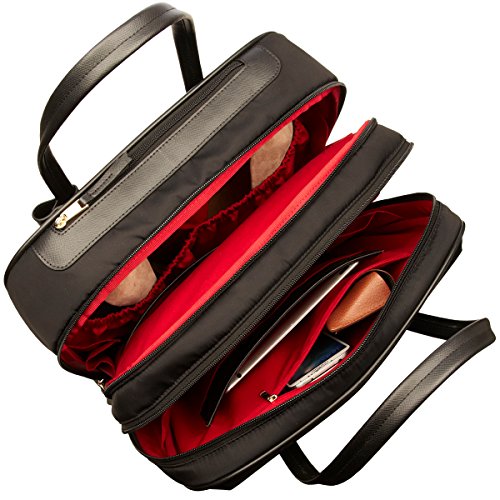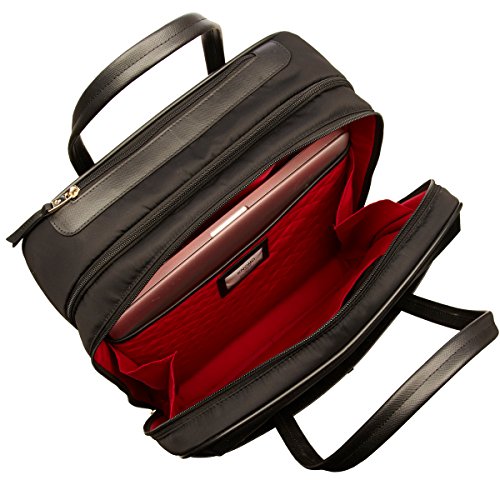 Sleek nylon exterior with saffiano leather trim^Colorful soft lining^Fastens securely with a nylon zipper at the top for main compartment^Two large main compartments: one with laptop pouch, organizer and zip pockets; the other with large slip pocket and elasticized pockets at back^Soft padded top grab handles with magnetic handle fastener