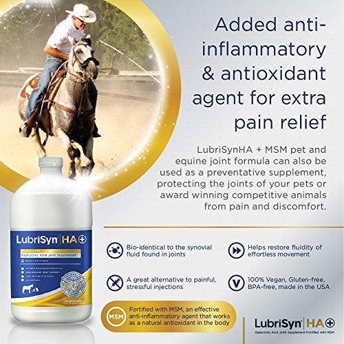 LubriSyn HA Plus with MSM for Equine & Pet Hyaluronic Acid is a naturally occurring component of joint fluid. It can only be supplemented by injection or by oral absorption. In studies, MSM (methylsulfonylmethane), has shown to relieve symptoms associated with osteoarthritis. These vital elements have come together to create LubriSynHA + for a natural, synergistic, anti-inflammatory effect. LubriSynHA Plus helps support your horse's connective tissues, is a natural antioxidant, and assists equine muscle tissue rebound from exercise stress and soreness. Highest Molecular Weight HA - Non-invasive Joint Support - Fast Acting (7-10 Days) - All Natural Ingredients - Gluten Free - BPA Free - Made in U.S.A.