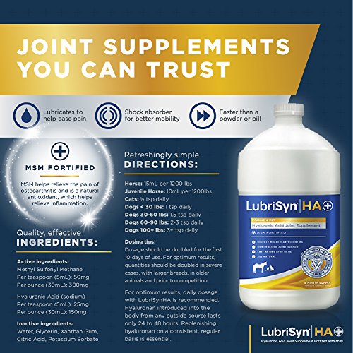 POWERFUL FORMULA FOR ANY PET: Lubrisyn HA + MSM Joint Supplement is intended for pets of all shapes and sizes; whether for preventative purposes - high-level performances, intense exercise and play - OR - mobility purposes, such as hip dysplasia, older pet arthritis or injury - our joint support liquid can be used for any small, medium or large dog, cat or horse.