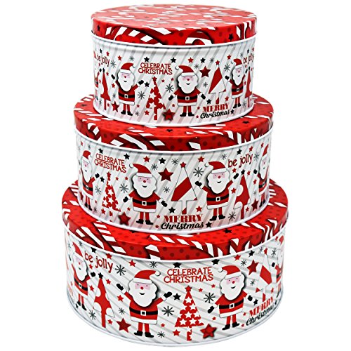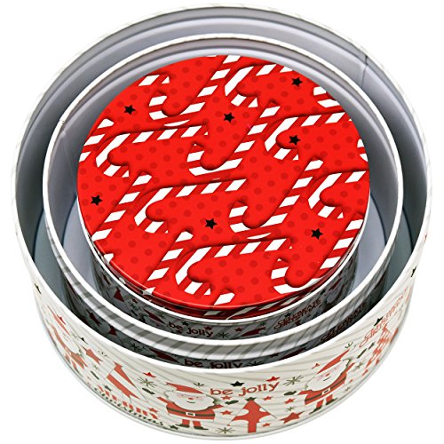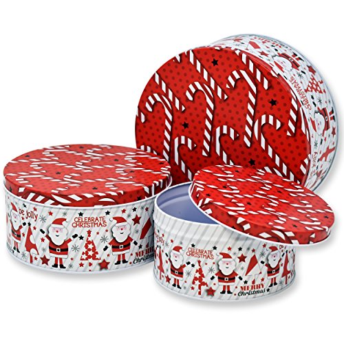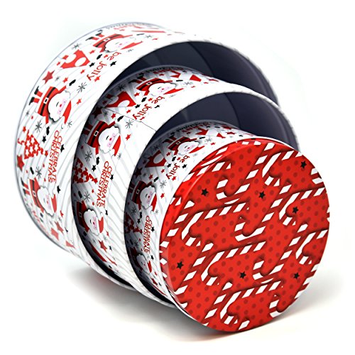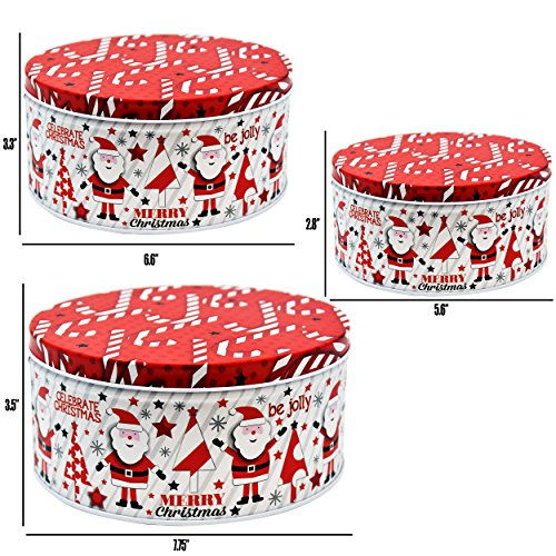 Christmas Nesting Cookie Tin Boxes with Metal Lid Cover, Set Of 3 Holiday Treat Goody Containers Party Favor Supplies: Red Santa and Candy Cane Design By Gift Boutique
