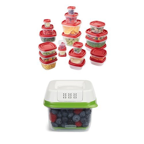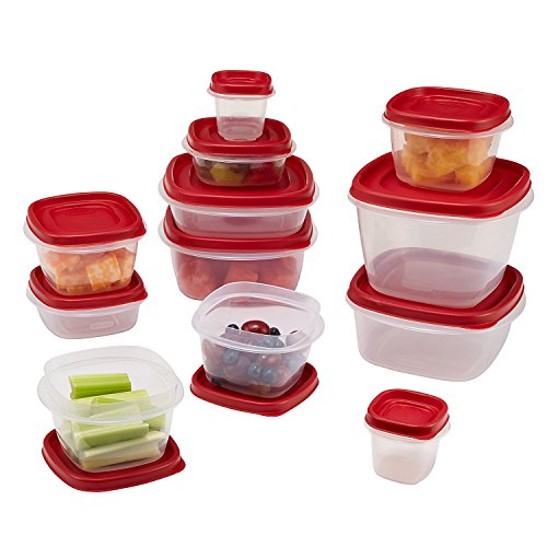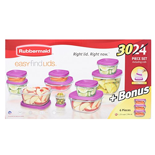 Find the right lid, right now! Rubbermaid easy find lids food storage containers feature lids that snap to the container base and to other lids, which means the right lid is always at your fingertips. The square-shaped food containers give you more space in the fridge and graduated sizes nest for cupboard storage. Organizing your kitchen just got easier with Rubbermaid easy find lids. 60-Piece food storage set includes (5) 0.5 cup, (5) 1.25 cup, (5) 2 cup, (5) 3 cup, (4) 5 cup, (3) 7 cup, (2) 9 cup, (1) 14 cup. All lids included.Feature