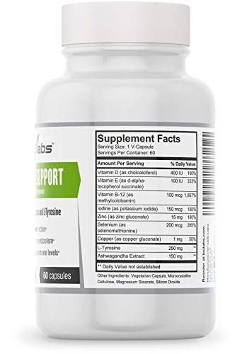 -. Binding : Health and Beauty -. Brand : LES Labs -. EAN : 0091037788856 -. Feature : SUPPORTS HEALTHY THYROID FUNCTION. Drug-free formula supports thyroid function and natural thyroid hormone synthesis. / PROMOTES HEALTHY METABOLISM AND WEIGHT MANAGEMENT. A healthy thyroid supports the body's metabolic processes and can assist in weight loss. / SUPPORTS THYROID HORMONE PRODUCTION. Essential nutrients like iodine and L-Tyrosine help to support healthy thyroid hormone production levels. / NATURAL INGREDIENTS. Natural formula including iodine, selenium, tyrosine, and ashwagandha extract. / 1 CAPSULE DAILY. 100% MONEY-BACK GUARANTEE. Try Thyroid Support and see how it works for you. All LES Labs supplements include a 60-day money-back guarantee. Our supplements are manufactured in the USA with the highest-quality ingredients from around the world. -. IsAdultProduct : 0 -. Label : LES Labs -. Manufacturer : LES Labs -. MPN : 2826279031 -. PartNumber : 2826279031 -. ProductGroup : Health and Beauty -. ProductTypeName : HEALTH_PERSONAL_CARE -. Publisher : LES Labs -. Studio : LES Labs -. Title : Thyroid Support (60 Capsules) • Supports Thyroid Function • Promotes Healthy Metabolism • Supports Thyroid Hormone Levels • With Iodine, Selenium, L-Tyrosine & Ashwagandha • 100% Satisfaction Guarantee -. UPC : 091037788856