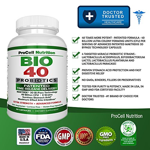 -. Binding : Health and Beauty -. Brand : BioScience Nutrition -. EAN : 0743541727868 -. Feature : ★ TESTED FOR PURITY & POTENCY, MADE IN USA IN A FDA CERTIFIED FACILITY - Proudly made in America in a USA FDA certified facility and THIRD PARTY TESTED with strict criteria to assure the high quality and purity. We're committed to ensuring that every product meets stringent quality control procedures for purity, potency, and safety. Our products are manufactured following strict GMP guidelines to ensure the highest quality products for our consumers. 100% SATISFACTION GUARANTEED. / ★ POTENT PATENTED FORMULA - 40 BILLION ULTRA COLONY FORMING UNITS per serving of advanced patented MAKTREK® 3D ByPass Technology capsules consistently delivers as many as 40 times or more the number of live, viable probiotic organisms past stomach acids than plain standard capsules. GET 40 TIMES MORE RESULTS THAN OTHER CAPSULES. With superior patented technology and 40 Billion CFUs, our living organisms reach deep into your intestinal tract and stay alive reaching where they are needed most. / ★ 4 TARGETED MIRACLE PROBIOTIC STRAINS scientifically formulated to deliver ultimate benefits. Lactobacillus Acidophilus maintains naturally existing intestinal flora. Bifidobacterium Lactis stimulates immune response and enhances the cellular immunity in the elderly. Lactobacillus Plantarum is a beneficial bacteria known for digestive support and supporting healthy cholesterol. Lactobacillus Paracasei treats diarrhea in infants, reduces pollen allergies and relieves chronic fatigue syndrome. / ★ PROVEN ADVANCED STOMACH ACID PROTECTION AND DIGESTIVE RELIEF - PATENTED MAKTREK® 3D BYPASS TECHNOLOGY Capsules ensures targeted release which delivers deeply into the intestines where other brands fail. Our capsules come with Kosher and vegetarian certifications. BioScience BIO-40 provides relief from the following symp: leaky gut syndrome, nausea, irritable bowel syndrome (IBS), inflammatory bowel disease, indigestion, sour stomach, acid reflux, gas, diarrhea, constipation and colitis. / ★ NO GMOs, BINDERS, FILLERS, PRESERVATIVES - Our probiotics supplement is completely pure and safe. There are no GMOs, artificial ingredients, fillers, binders, preservatives or stearates in our supplement. It is also FREE OF soy, gluten, milk, egg, shellfish, corn, wheat, and peanuts. We only include what you need - the most potent and highest 40 Billion CFU dosage on the market for SUPERIOR POTENCY and extra fast GI relief. Choose the most efficient and pure formulation - ProCell BIO-40 -. IsAdultProduct : 0 -. Label : BioScience Nutrition -. Manufacturer : BioScience Nutrition -. MPN : PC001 -. PackageQuantity : 1 -. PartNumber : PC001 -. ProductGroup : Health and Beauty -. ProductTypeName : HEALTH_PERSONAL_CARE -. Publisher : BioScience Nutrition -. Studio : BioScience Nutrition -. Title : BIO-40 : #1 Recommended Best Probiotic Supplement : 60 Time Release Capsules 40x More Effective - Patented Delivery Technology - 40 Billion CFU of Most Essential Strains - Improves Digestive Health -. UPC : 743541727868