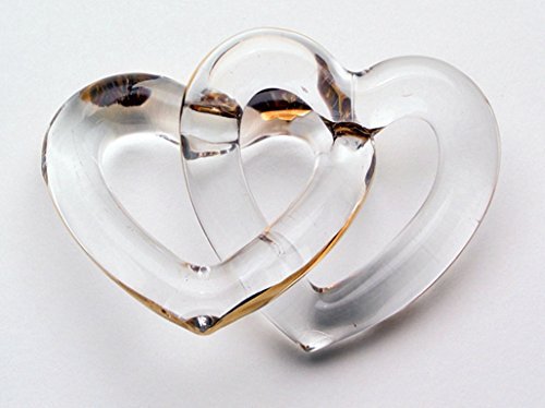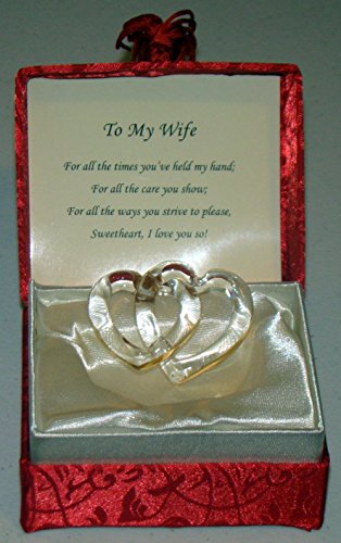 Interlocking hearts Messenger keepsake is a unique hand-crafted design in glass accented with hand painted 24 carat gold and set in a satin-lined gift-quality linen box. Inside of box contains sentiment message: "To My Wife: For all the times you've held my hand ; For all the care you show: For all the ways you strive to please; Sweetheart, I love you so!"