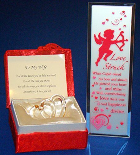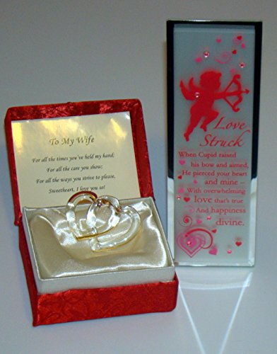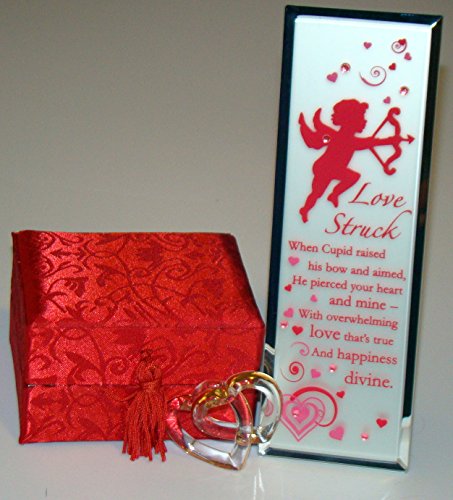 The Love Struck Set is the perfect memento for your wife to let her know how much you love her. Set includes 7-inch Love Struck Mirrored Plaque and 2-inch Interlocking Glass Hearts Accented with 24k gold.