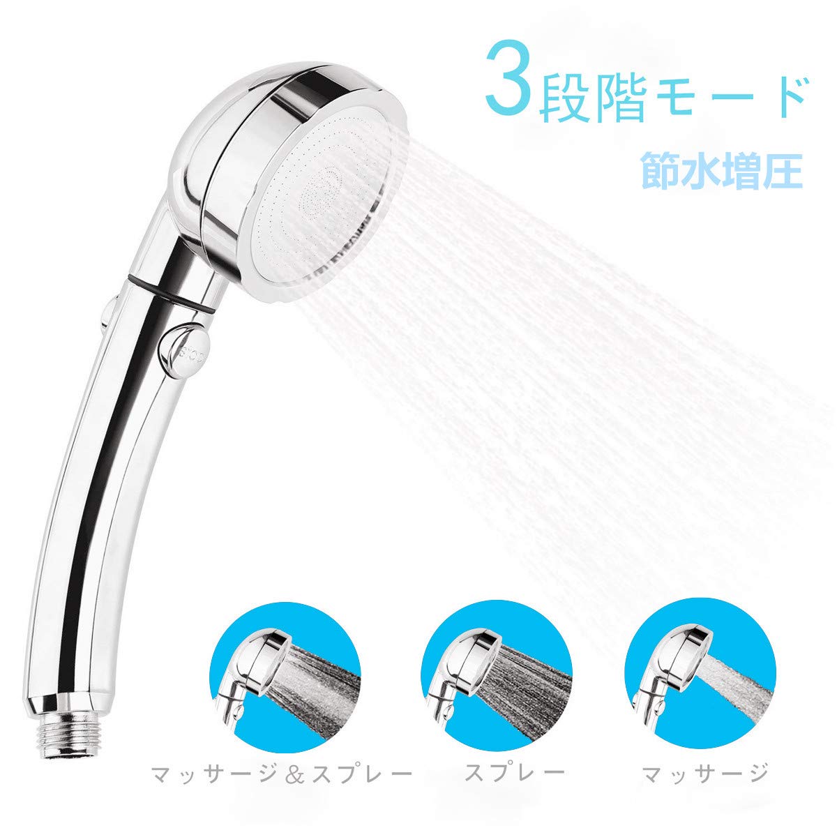 🚿【3段階モード】異なるシャワー心地が楽しめる3段階の吐水モードがある、ニーズによって選択します。一つボタンだけで簡単に切り替えることができます。♥スプレーモード:洗顔や敏感肌、乳幼児に最適なスプレー水流です。♥マッサージ:毛穴に詰まった汗や皮脂などの汚れをキレイに洗い流して、頭皮清浄や洗髪に適用する水流です。♥マッサージ&スプレー:シャワーが終わったら、このモードを切り替えて、水流は母親の愛撫のように、首と肩の緊張を疲れの感じが少なくなります。