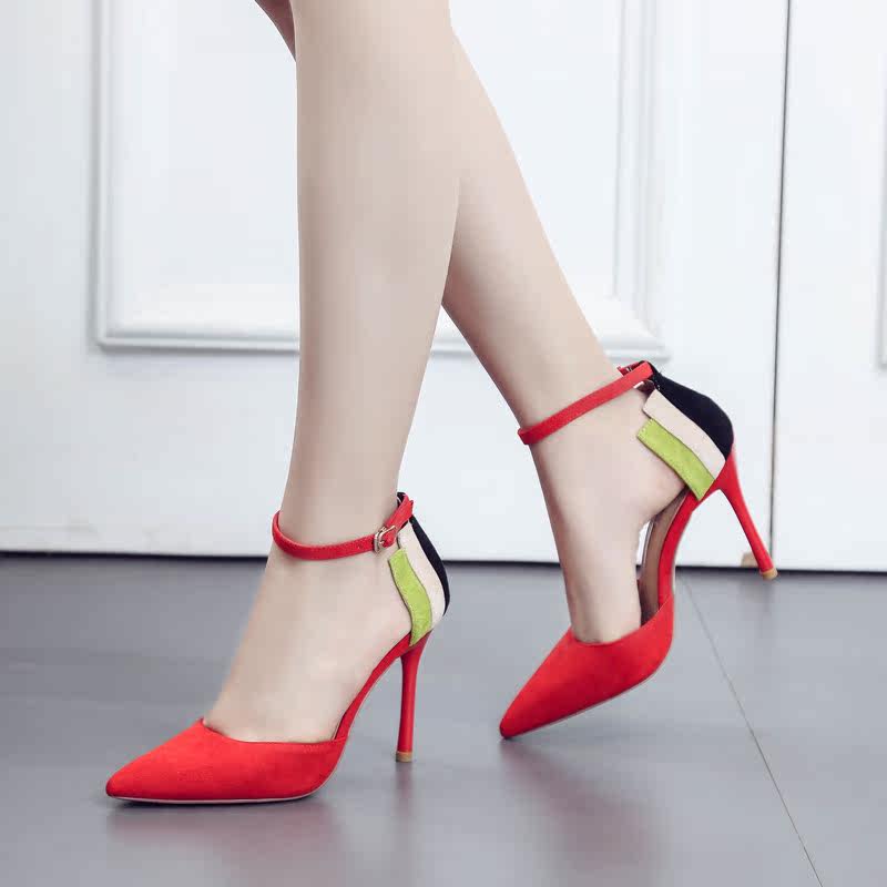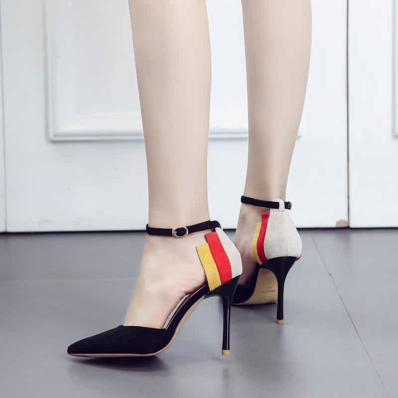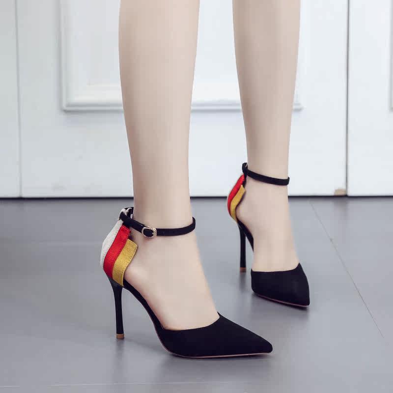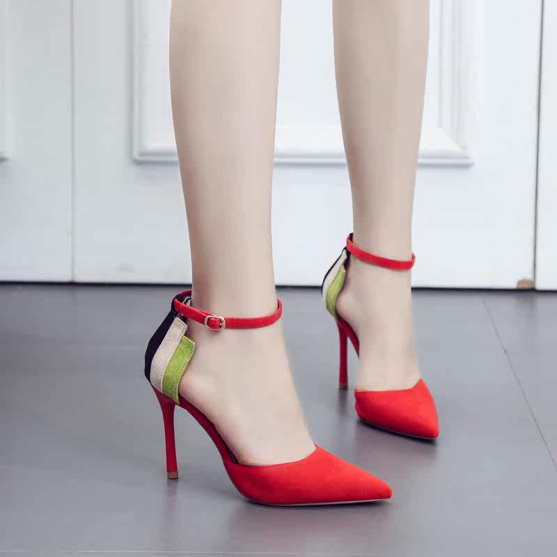 尖头高跟鞋细跟2018春季新款韩版一字扣凉鞋女士夏天百搭绒面女鞋