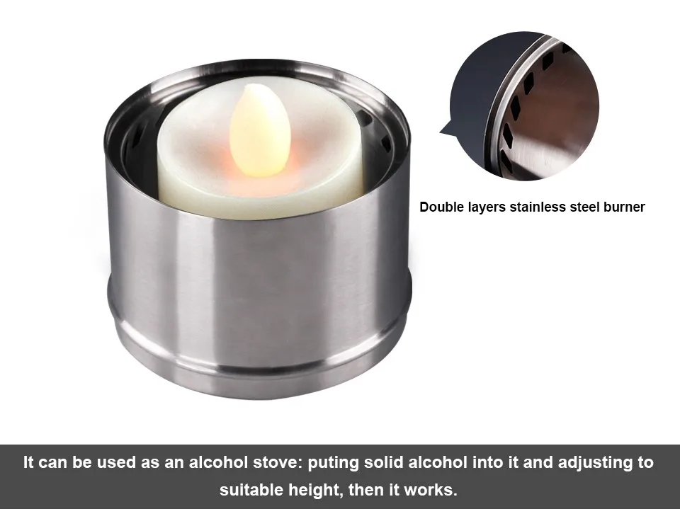 6.It can be used as an alcohol stove: puting solid alcohol into it and adjusting to suitable height, then it works.?