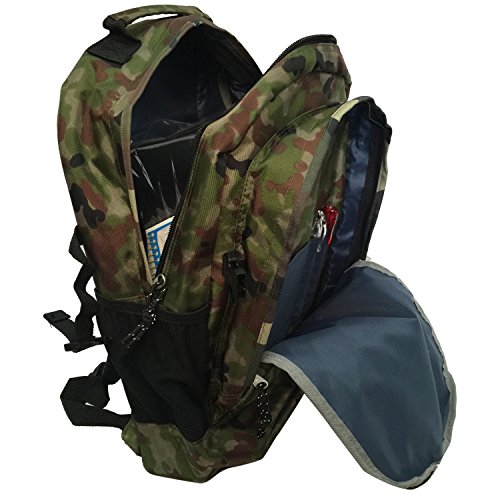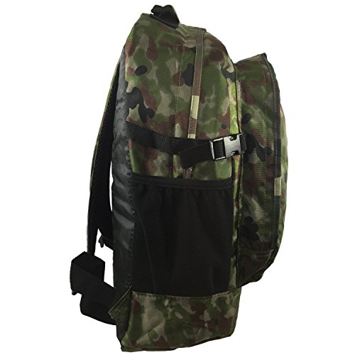 Product Description Large camouflage student book bag for students. Padded handles and shoulder straps. Mesh pockets on both sides to hold drinks and bottles. Material: Nylon Camouflage Dimension: 17.5" x 12" x 6". 0