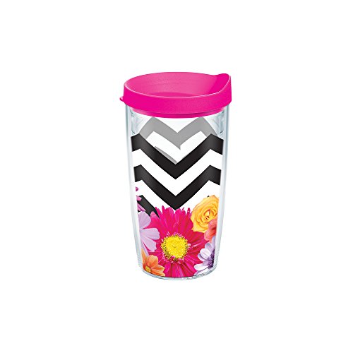 Tervis 1209821 Black And White Chevron Floral Wrap Tumbler with Neon Pink Lid, 16 oz, Clear