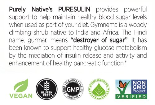 Purely Native's PURESULIN provides powerful support to help maintain healthy blood sugar levels when used as part of your diet. Each capsule contains the highest quality, most bio-available levels of Gymnema, Berberine, Cinnamon, Chromium & Calcium which can help manage your blood sugar, lower cholesterol levels, promote weight loss, supports mental health, boosts the immune system & help reduce joint pain.