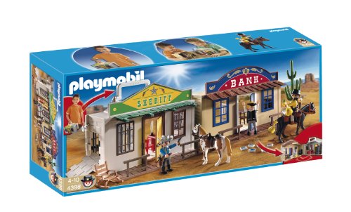 -. Binding : Toy -. Brand : PLAYMOBIL® -. EAN : 5053460622898 -. Feature : Create your own western adventure / Stop the prisoner from escaping through the breakaway wall / Playmobil is the largest toy manufacturer in Germany / Figures can bend, sit, stand and turn their heads / Includes three figures, two horses, furniture and accessories all in a foldable take along case -. IsAdultProduct : 0 -. Label : PLAYMOBIL -. Manufacturer : PLAYMOBIL -. Model : 4398 -. MPN : 4398 -. PackageQuantity : 1 -. PartNumber : 4398 -. ProductGroup : Toy -. ProductTypeName : TOYS_AND_GAMES -. Publisher : PLAYMOBIL -. SKU : B004LMIITS -. Studio : PLAYMOBIL -. Title : PLAYMOBIL My Take Along Western City -. UPC : 400941692454 -. Warranty : 30 day warranty against manufacturer defects