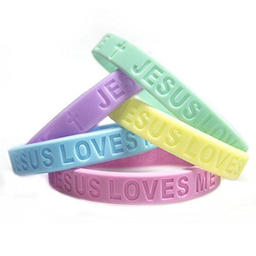 -. Feature : Goods For Giving · Jesus Loves Me Wristband Combo · 5 Pack / COMFORTABLE · 1/8'' Thick · 1/2'' Wide · 8'' Long / SAFE · 100% Silicone · Latex Free · Hypo Allergenic · Non-Conductive / QUALITY · no glues to separate and fall apart