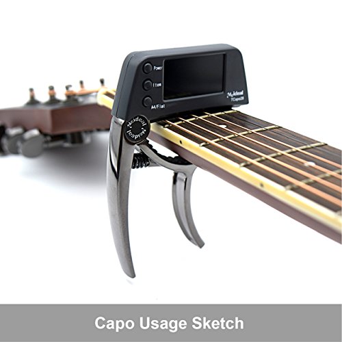 Guitar Tuner-Designed for beginners and professionals. Easy tuning on stage, clip on style. Easily applied and adjusted with one hand. Standard tuning. Drop tuning. Use it with a capo too. Fast and accurate. Easy and intuitive to use.•Guitar Capo Tuner-Combines a capo with a tuner. Stylish Metal Design with a Bright Double Color Display Easy to Read Pretty Accurate Tuning