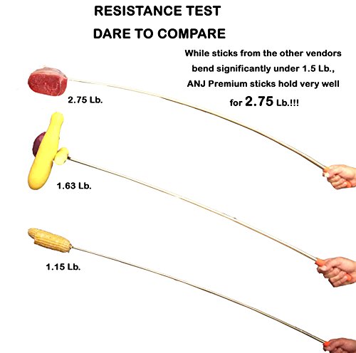 PREMIUM QUALITY AT A WHOLE DIFFERENT LEVEL: Using more non-toxic, heat-treated, FDA approved 304 stainless steel makes our marshmallow roasting sticks the sturdiest in the market!! The premium quality of our sticks is at a whole different level! Just check our resistance test picture on the left. While sticks from other vendors will bend significantly with load under 1.5 Lb., ours hold very strong for even 2.75 Lb.!!!