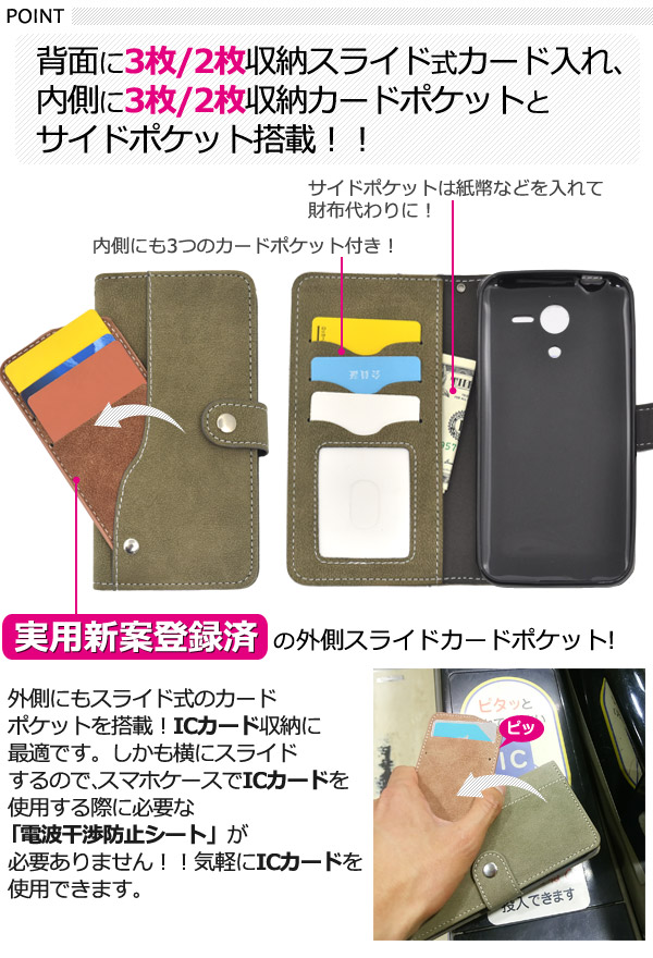 背面に2枚収納スライド式カード入れ、内側に2枚収納カードポケットとサイドポケット搭載した、