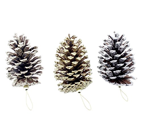 - Includes 3 real pines cones with hanging string loop and adorned in gold & silver glitter