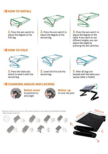 -. Feature : Multipurpose: It acts as a multifunctional laptop workstation, a book/tablet stand, a standing desk for office work, writing desk, book tray, a TV tray for snacking, a dinner table, a laptop bed stand for relaxing in bed or on a sofa, couch / Easy to use Trifold Leg with 3 rotating locking joints with 360 degree rotatioto to meet your various posture demands(on couch, bed, sofa or carpet occasions), choose a comfortable position and angle / Lightweight & Portable: This laptop table stand is made of aluminum alloy, strong and durable. It can be easily folded flat for convenient storage, light enough to carry around / Board dimensions: 420x260mm. Hmax = 48cm. Suitable for 7-15 inch laptops/notebooks/tablets/magazines/books/iPad etc. / Great for indoor or outdoor activities such as camping, picnic, and car boot sales, BBQ, buffets, playgroups etc. Best gift choice for families, friends, colleagues and so on