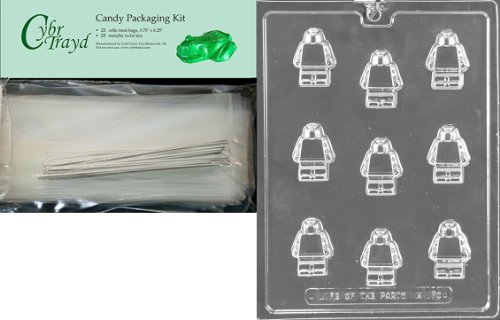 Cybrtrayd Mdk25S-K170 Building Block Man Chocolate Candy Mold with Packaging Bundle, Includes 25 Cello Bags and 25 Silver Twist Ties