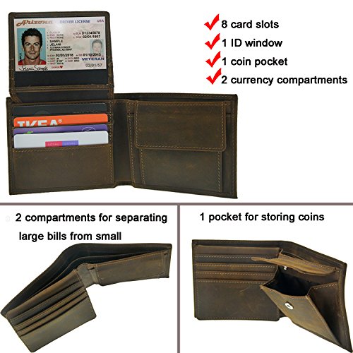 Binding : Apparel Product Description Remarks: Tha leather wallet for men made by crazy horse leather. The distinguishing feature of the crazy-horse leather is that leather items may have wrinkles, scars, scratches that are inherent characteristics and natural beauty of the hide to present the style of retro and wildness. When you scrape it widely, the trace will be appeared .If the trace is not obvious, you can wipe it gently and then the trace will be less. Structure: 1* ID window pockets 1* Pocket to store coins 2* Bill compartment 8* Card slot pockets Packaging: 1* Wallet 1* Black Gift Box 0