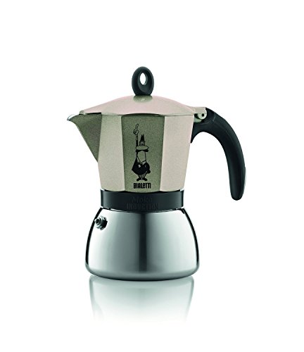 Studio : Moka Induction Publisher : Moka Induction Binding : Home Product Description This 3 cup espresso maker by Bialetti is part of its Moka range. It has an aluminium upper body in light gold with a stainless steel lower section. The coffee maker has a grey handle, knob and central band. It is suitable for all hobs including induction. The coffee maker has an overall height of 16,5cm/6,5in and a base diameter of 10cm/3,9in. The inside of the upper section has a special paint finish. Please note that this cup size is based on espresso cup sizes and not on regular tea or coffee cup sizes. 0