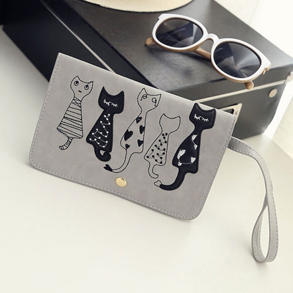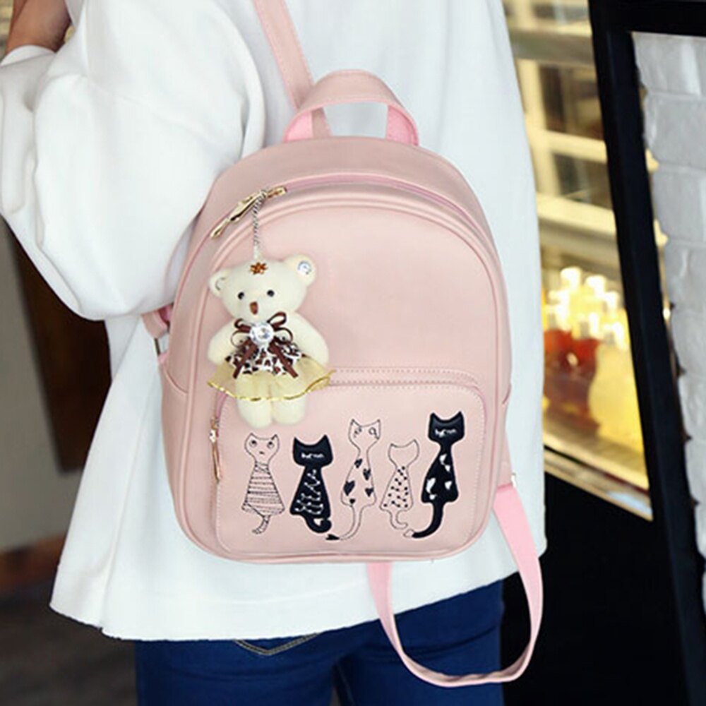 2017 New 4pcs Lovely Cartoon Cat Printed Girls PU Leather BackpackShoulder Bag Clutch Bag Card Holder
