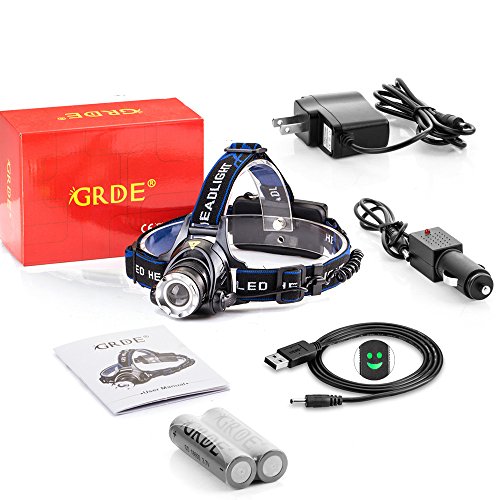 - Title : GRDE Zoomable 3 Modes 1800 Lumens Super Bright LED Headlamp with Rechargeable Batteries and Car Charger and AC Charger and USB Cable