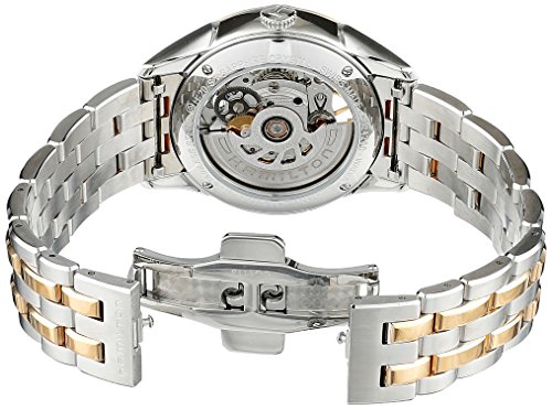 Stainless steel case with a two-tone (silver and rose gold-tone) stainless steel bracelet. Fixed rose gold PVD bezel. White skeleton dial with luminous rose gold-tone hands and index hour markers. Minute markers around the outer rim. Dial Type: Analog. Automatic movement. Scratch resistant sapphire crystal. Pull / push crown. Skeleton case back. Case diameter: 36 mm. Case thickness: 11 mm. Round case shape. Band width: 20.3 mm. Band length: 8 inches. Fold over clasp with safety release . Water resistant at 50 meters / 165 feet. Casual watch style. Hamilton Jazzmaster Automatic Skeleton Dial Two-tone Ladies Watch H32425251.Feature