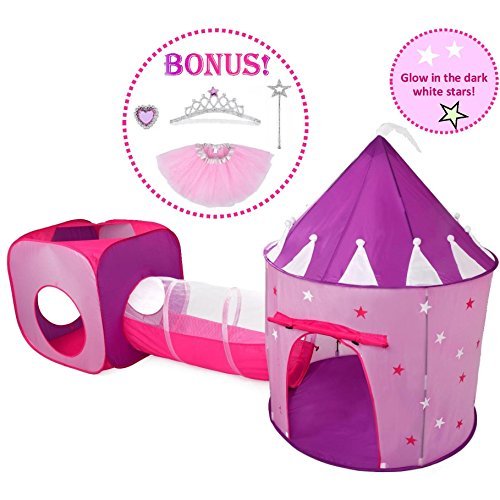 Hide-n-Side Tents and Tunnels are the perfect place to practice crawling, sensory processing and coordination activities. Also, a great place to just hang out! These vibrantly-colored, friendly-faced play house and tunnels make a lovely, bright and inviting place for kids to play. Children love to explore, play pretend inside and even to use them as a refuge from the light, noise and hustle of a busy home or classroom. Castle and tunnel collapse for easy storage and store compactly and conveniently in the accompanying bag, making them suitable for small homes, apartments or daycares. Made from polyester with a wrapped steel spring frame sewn safely and securely into a fabric sleeve. These crawling tents and tunnels are designed for years of play! This 7pc Princess Tent Set is ideal for beautiful little Girls! This Princess Castle Stars, glow in the dark. Bonus Princess Dress up Tutu Costume set enclosed!