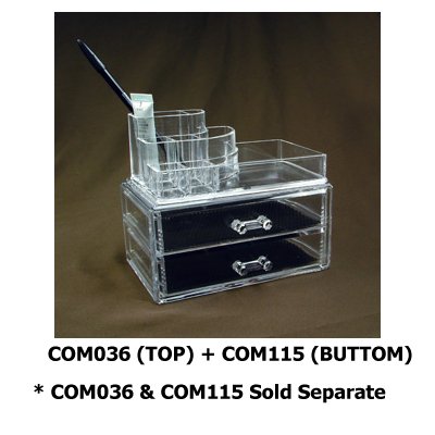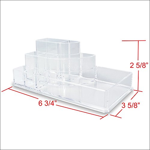 - Feature : Durable clear acrylic organizes your lipsticks and accesories. / 4 lipsticks compartments, 1 large compartment and 3 medium compartments. / Product Dimension: 6 3/4"W x 3 5/8"D x 2 5/8"H / (Brush and Makeup not included) . Easily fits on vanity, counter-tops, or in drawers.
