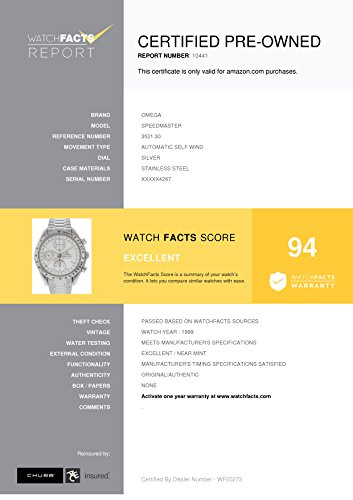 -. Feature : Omega Speedmaster 3521.30 with 6 inches band, stainless-steel bezel and silver dial / Authenticated by WatchFacts. Grade Rating: 94 / Condition: Excellent / No papers offered with this watch / Automatic-self-wind movement / Watch year: 1999
