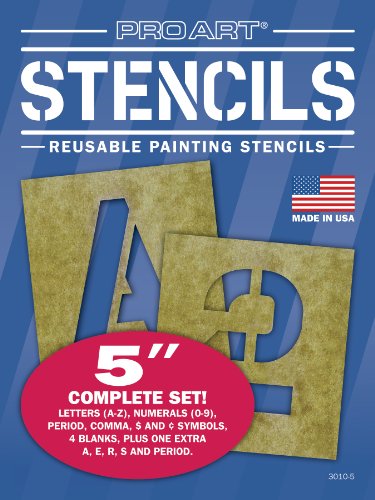 Pro Art painting stencils for lettering posters, signs, notebooks, mailboxes, equipment, etc. Reusable heavy precut stencils on individual sheets with large borders for space variance. For use with spray paint and brush work. Each set contains letters A through Z, numerals 0 through 9, period, comma, cent and dollar symbols, four blanks plus one extra A, E, R, S and period. Available in several different sizes.Feature