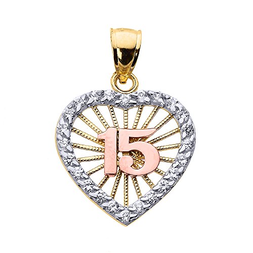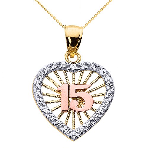 -. Binding : Jewelry -. Brand : Quinceanera Jewelry -. Color : Gold -. Department : womens -. Feature : heart-shaped gift for the sweet 15 Quinceanera or fiesta de quince anos individually hand-set with clear cubic zirconia stones / exquisitely handcrafted with solid 10 karat 3-tone gold (white gold, yellow gold, and rose gold) in perfect polished finish / comes with free special gift packaging / made in the USA yet offered at factory direct jewelry P.R.Ice / ships from the manufacturer directly to the customers -. Label : Claddagh Gold -. Manufacturer : Claddagh Gold -. Model : QP3055Y -. MPN : QP3055Y -. PartNumber : QP3055Y -. ProductGroup : Jewelry -. ProductTypeName : FASHIONNECKLACEBRACELETANKLET -. Publisher : Claddagh Gold -. Studio : Claddagh Gold -. Title : 10k Tri-Color Gold Sweet 15 Años Quinceanera Pendant Necklace with Cubic Zirconia Heart