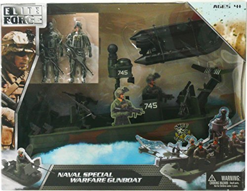 The Elite Force Air to Land Mission Naval Special Warfare Gunboat Playset is the tactical power you need when the battle mission calls for the best on both land and sea. This playset includes one plastic gunboat, one plastic inflatable rubber boat, two special ops action figures standing approximately 5" tall, one 05 machine gun with protector and two M134 machine guns.