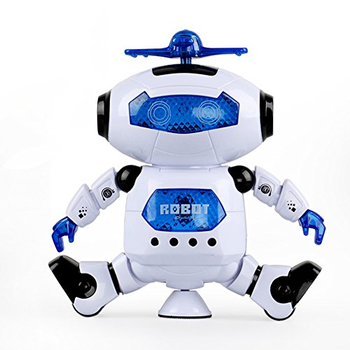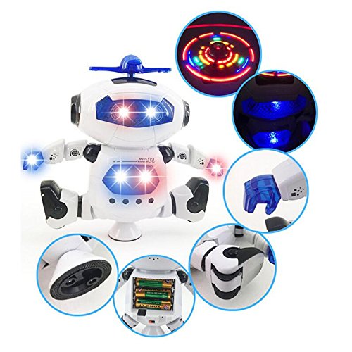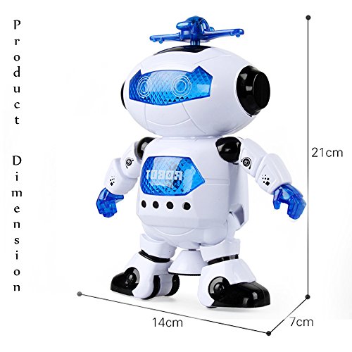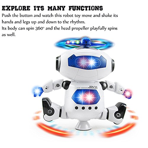 -. Feature : Encourage physical activities: if your child is caught up on too much virtual gaming like playing on cellphones, computers and tablets, this electronic robot is a way to encourage physical activities. / Learn and play: who said, toys cannot be educational and fun at the same time? You can teach your child about different parts of the body, colors and moves with the help this dancing robot toy. / Dancing entertaining robot: a great way to keep the little ones entertained. Just push the button and watch it move and shake its hands and legs to the rhythm. Its body can spin up to 360 degrees and the head propeller spins as well. / Help improve skills: this offers, not just fun but can also help enhance skills such as hand-eye coordination. The fun flashing lights, vibrant colors and happy dancing moves, will stimulate your baby's senses and help develop sight. / Great gift for any occasion: toddlers, pre-schoolers, boys and girls of any age will surely love this robotic toy. That is why it's also an ideal birthday gift or party favor for any occasion.