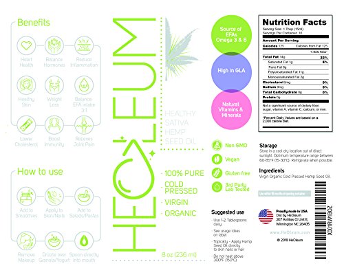 THE HOLY GRAIL OF HEALTHY OILS. Consumer's and health pro's are figuring out why eastern medicine gave hempseed this moniker. Provides the ideal 3:1 Omega Fatty Acid balance for your diet. Improves cardio. Cures Acne w/o clogging pores. Moisturizes skin, hair & nails. Weight loss thanks to high CLA. Almost endlist list of health benefits.